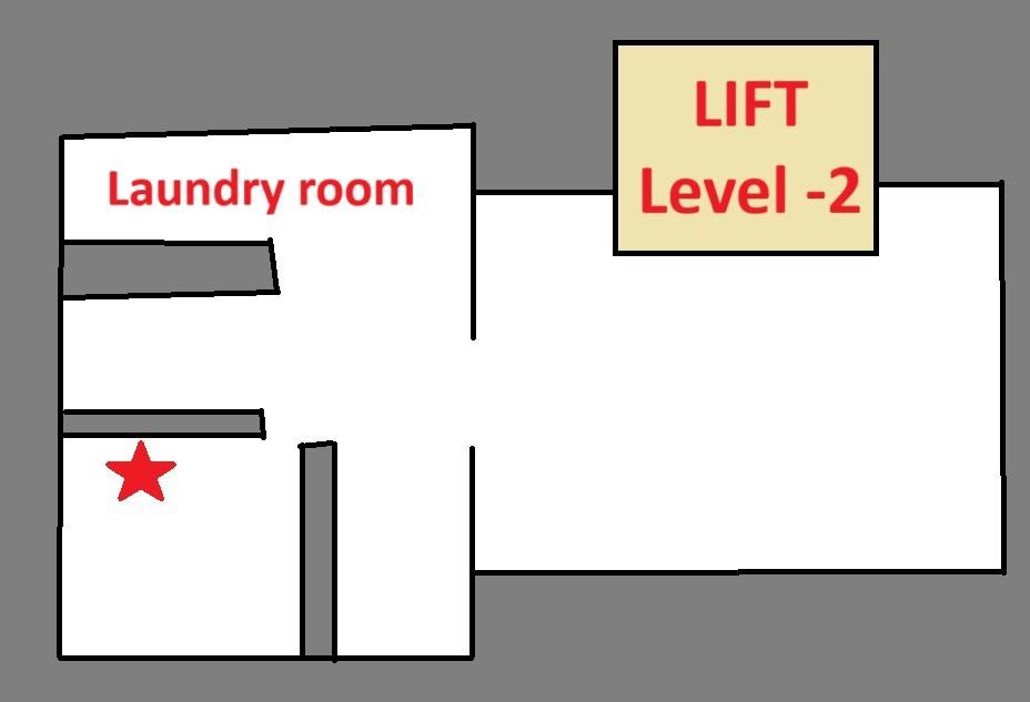 Depuis le bâtiment 100, descendez au niveau -2, sortez du local "LIFT Level -2" et rejoignez la buanderie marquée d'une étoile sur le schéma ci-dessous.