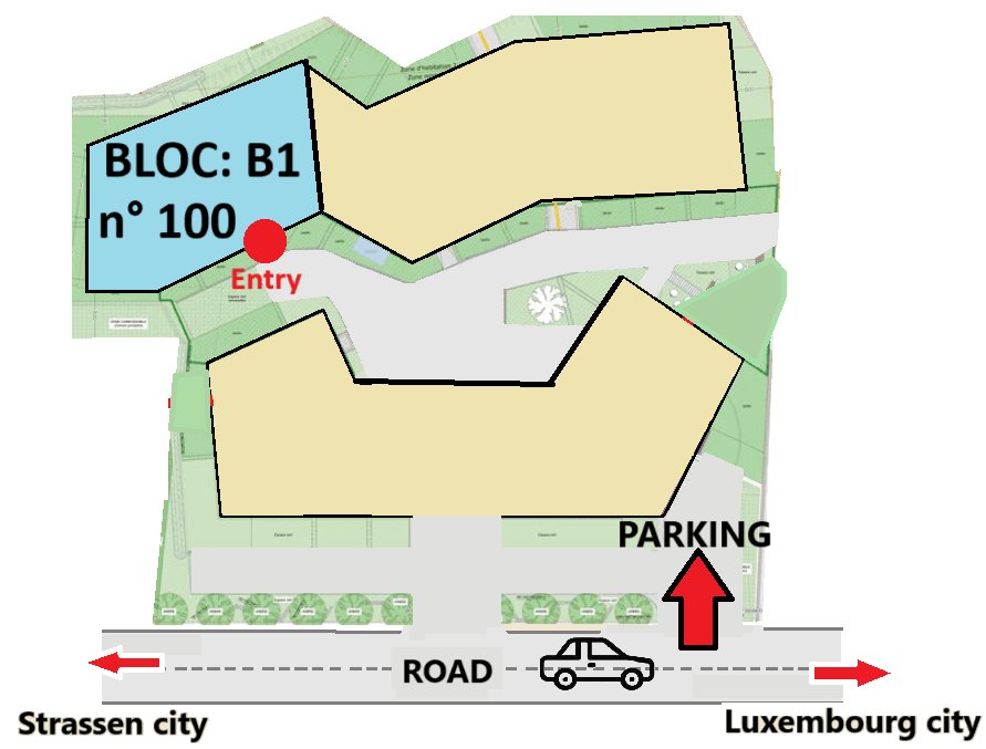 Rejoignez ensuite le point rouge sur le plan pour accéder et entrer dans le bâtiment 100 où se trouve votre appartement. Cette porte se trouve à gauche de votre emplacement de parking.