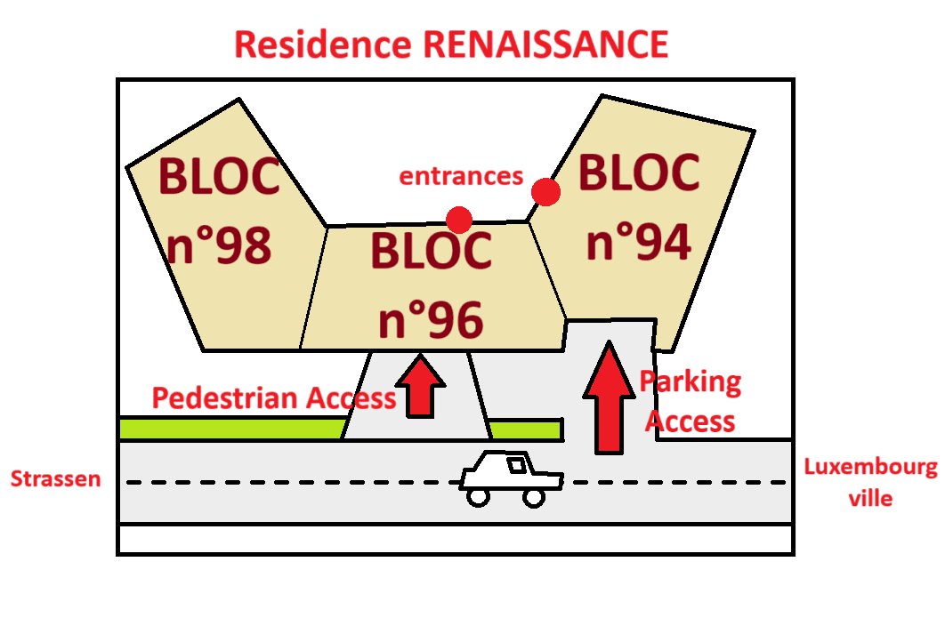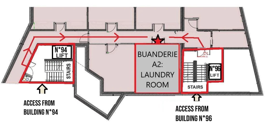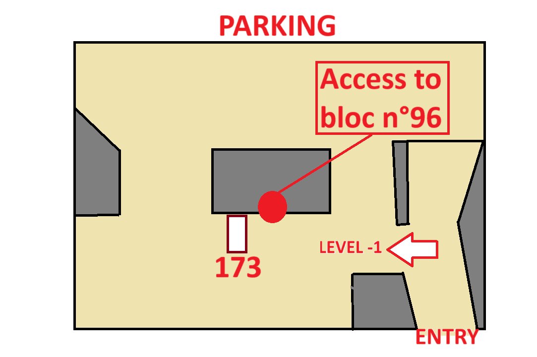Rejoignez ensuite le point rouge sur le plan pour accéder et entrer dans le bâtiment 96 où se trouve votre appartement. La porte est juste à côté de botre emplacement de parking. Il est affiché "Accès Résidence" sur la porte.