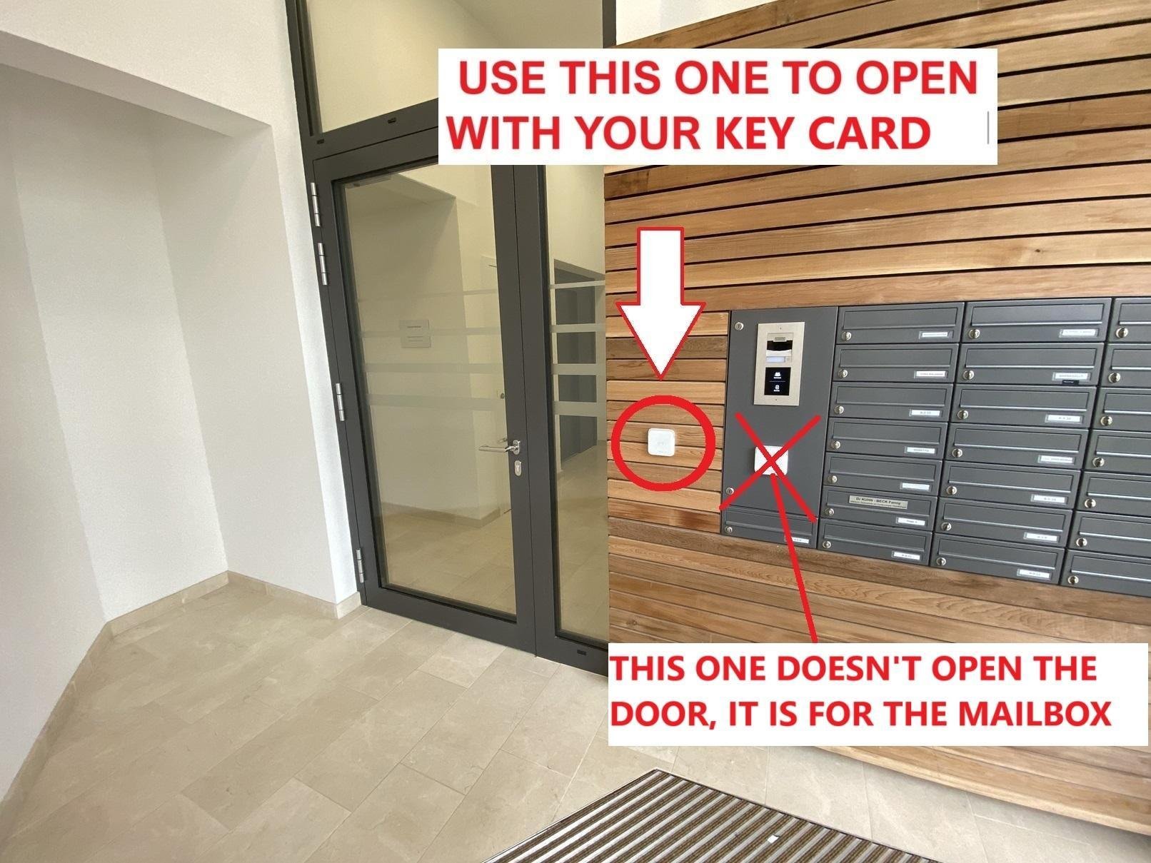 Utilisez votre carte magnétique (ou votre digital key) pour ouvrir la porte de votre appartement en la scannant sur le boitier ci-dessous situé juste à côté de la porte d'entrée.