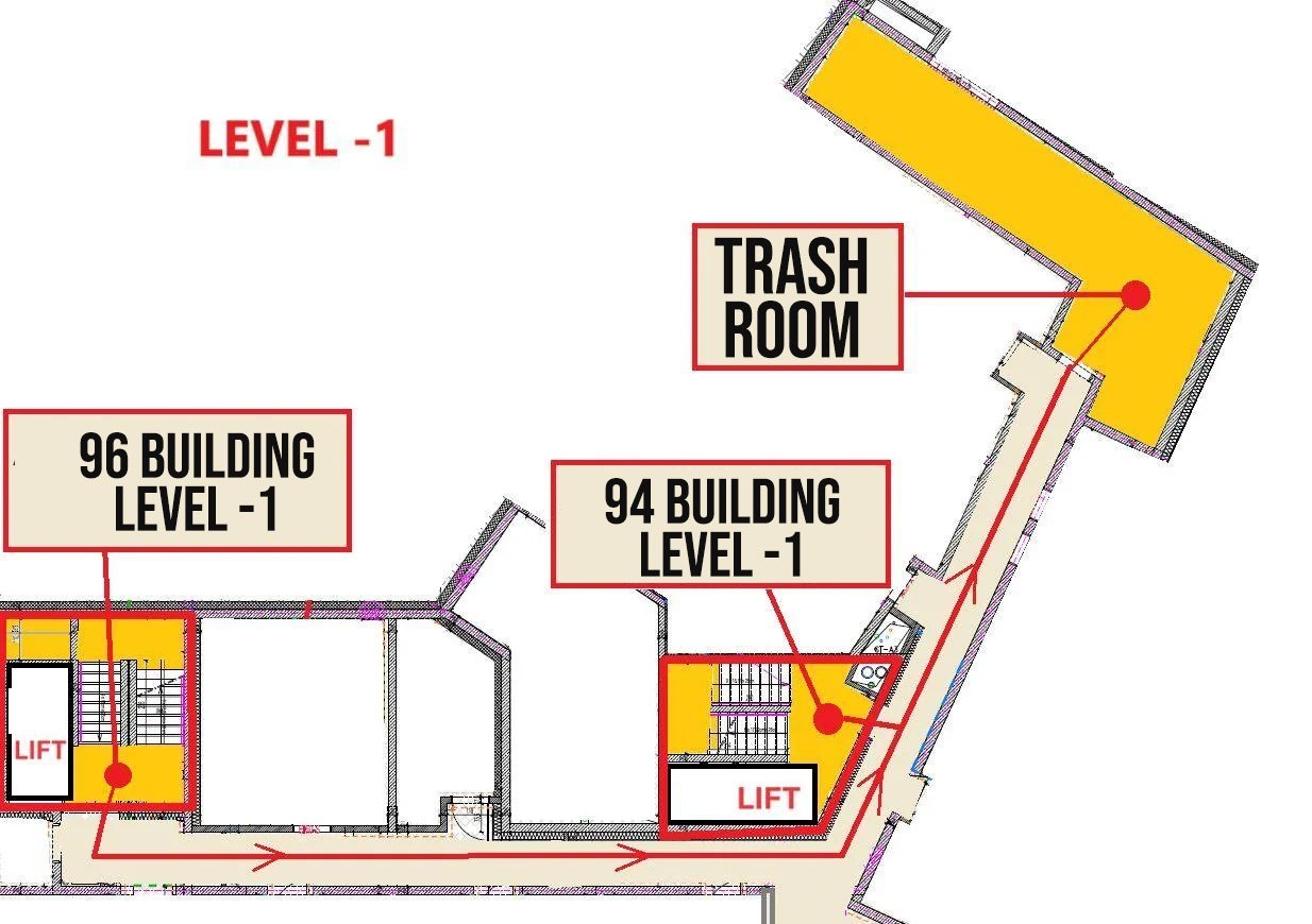 Descendez au niveau -1 puis tournez à gauche pour rejoindre le local poubelles tout au fond du couloir.