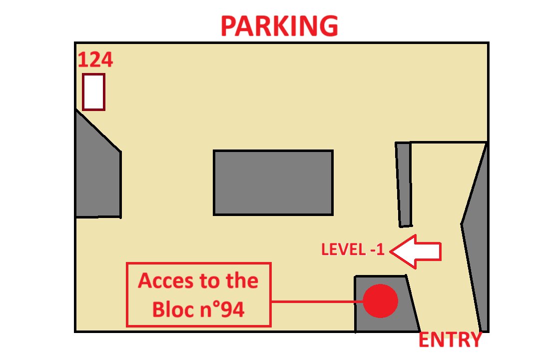 Votre place de parking est la n°124, située au niveau -1 du garage.