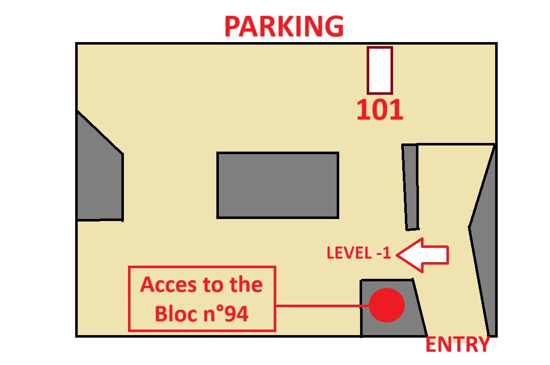 Votre place de parking est la n°101, située au niveau -1 du garage.